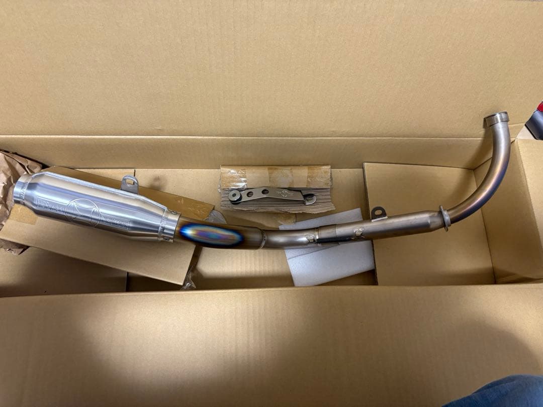 約全長47cm 42.4mm 45mm 48.6mm 太さ1.6mmのパイプを順に太くして制作ワンオフバッフルは芯の細いパイプを2mm以上の、肉厚にして低音の良い音ですまたM6ボルトで簡単に取り外せるんで直管爆音サウンドが楽しめます直管とはいえエキパイのみとは、比べ物にならない良い音で低音爆音です、肉厚1.6なのでよくあるマフラーやエキパイの肉厚は1.2ですスリップオン部は1ミリほど遊びがある為マフラー用エキガス液体ガスケットを塗布おすすめしますが5センチほど差し込まれているので気にならならいひとは大丈夫です、エキパイ、エンジン部ではないので市販のシリコンや普通の液体ガスケットでも全然大丈夫ですマフラーステー3ミリ厚のステールを両面溶接しておりますので頑丈なんでバンドなしで大丈夫ですし見た目にスッキリ、フルエキのようにみえるのでカッコいいです耐熱半艶ブラック塗装塗料は写真10のソフト99の良い塗料です写真10の塗料以外がセット内容です取り付け車両のエキパイは純正のエキパイを、同じ塗料で塗装しております純正マフラーと同じようにスリップオンフィッティング車両はエストレアRSのbj250a互換性はわかりかねますがエストレアなら大丈夫だとおもいます!TRはマフラー取り付け位置が同じならエキパイ、エンジンは同じだと思うので付くかもですフィッティングは自己責任でお願いいたしワンオフバッフルの細い部を長く取っているのはここにガラスウールやスチールウールを巻くと静かになり音質も変わります音確認動画 https://lite.tiktok.com/t/ZSDQHLfYF/レビュー